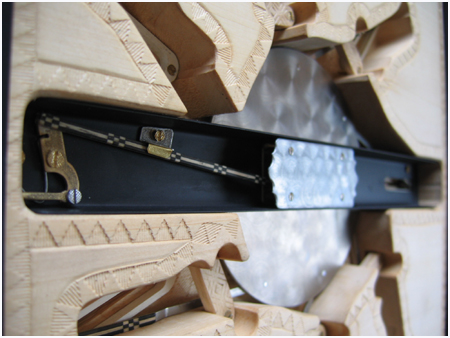 Tous les éléments ont été faits main et sont entièrement démontables. J’ai laissé le mécanisme apparent, visible grâce au reflet d’un miroir.