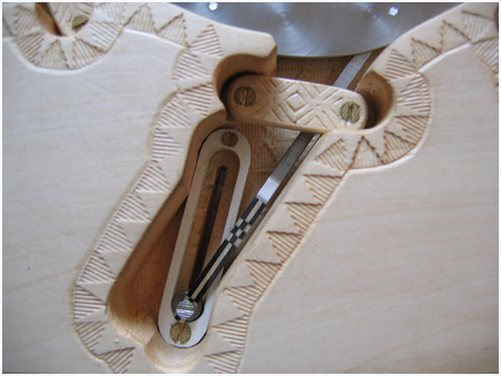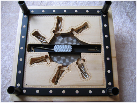 Le support monobloc est en sycomore, il symbolise le « sable blanc » est entièrement sculpté et ciselé main. J’y ai intégré et adapté un mouvement mécanique très puissant, transformant le mouvement rotatif en mouvement linéaire permettant d’éloigner simultanément et très lentement chaque bras du centre de la création afin de faciliter leur préhension.