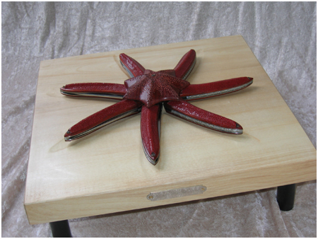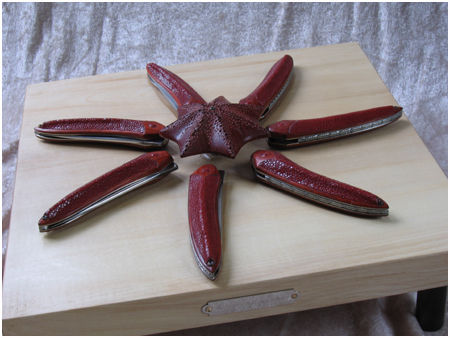 - Les manches sont en bois « satiné rubané » de couleur rouge orangé comme les étoiles de mer. J’ai ajusté et collé à « mi-bois » sur un des côtés du cuir de galuchat pour imiter la forme et la texture de l’étoile de mer.