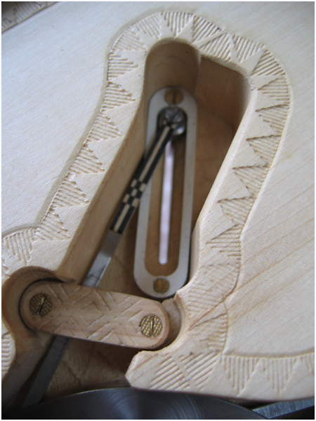 En tournant le « bouton sculpture » central dans le sens des aiguilles d’une montre, on arme le mécanisme ; le déclenchement se fait par un bouton latéral masqué qui libère très lentement les sept couteaux…
